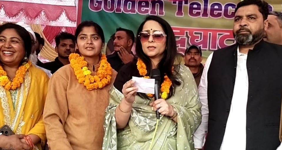 गोल्डन टेलीकॉम एंड इलेक्ट्रॉनिक्स शोरूम का मुख्यातिथि के रूप में पहुंची विधायक उमेश कुमार की धर्मपत्नी सोनिया शर्मा ने फीता काटकर उद्घाटन किया