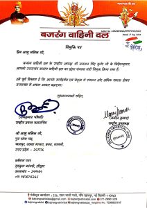 बजरंग वाहिनी दल के राष्ट्रीय अध्यक्ष अध्यक्ष श्री गजराज सिंह द्वारा बजरंग वाहिनी दल का विस्तार करते हुए आशु मलिक को बजरंग वाहिनी दल उत्तराखंड का प्रदेश संगठन मंत्री नियुक्त किया गया है।