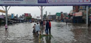 रुड़की।आज रात भर हुई भारी बारिश से नगर का जीवन पूरी तरह अस्त-व्यस्त हो गया।नगर के कई इलाकों में भारी जलभराव के साथ ही रामपुर चुंगी समुद्र में तब्दील हो गया,जिससे भारी वाहनों को भी रामपुर चुंगी से गुजरने में बड़ी कठिनाईयों का सामना करना पड़ा।हजारों की संख्या में अपने-अपने कार्यों के लिए प्रातः से ही घरों से निकले लोग रामपुर चुंगी से नहीं गुजर सके,जिससे उन्हें वापस घर लौटना पड़ा।आज रात हुई भारी बारिश से जहां नगर के अनेक गली-मोहल्लों में भारी जल भराव गया गया,वहीं रुड़की नगर के अनेक वार्डों में भी जबरदस्त पानी भर गया।पानी की निकासी ने होने से लोगों को आवाजाही में भारी मुस्क्कत उठानी पड़ी।गलियों में पानी भरा होने के चलते लोग अपने-अपने घरों में कैद होकर रह गए ।रामपुर चुंगी तो मानो समुद्र में तब्दील हो गई।रामपुर चुंगी पर जलभराव की समस्या काफी जटिल हो गई है और पिछले अनेक वर्षों से बरसात के मौसम में यहां पर कई-कई फीट पानी भर जाता है,इसका मुख्य कारण बड़े नाले का अतिक्रमण तथा बढ़ती आबादी के कारण बनाई गई बड़ी-बड़ी मंजिलें हैं।पिछले दस-बारह वर्षों से यह समस्या बहुत जटिल हो गई है,इससे पूर्व बरसात