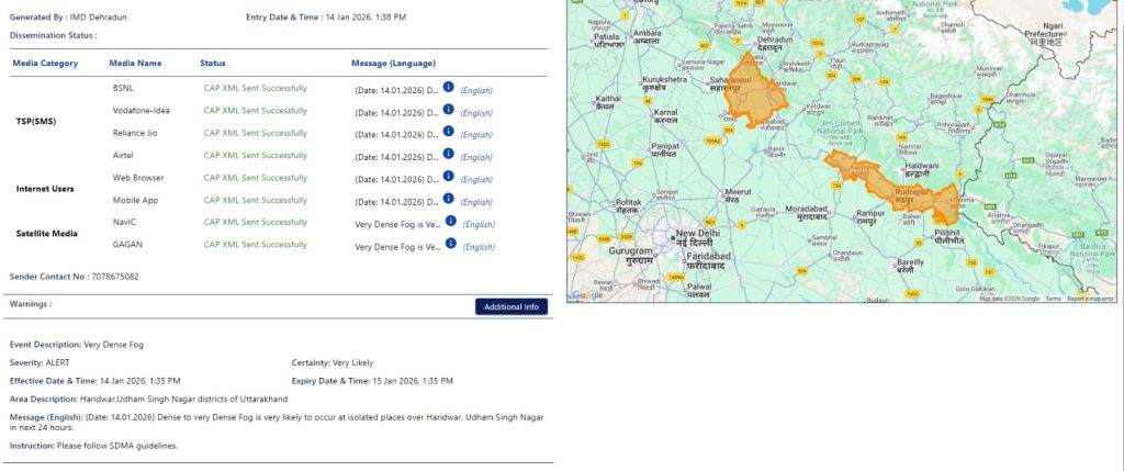 2026, 1:35 PM बजे से 15 Jan 2026, 1:35 PM बजे तक) *जनपद* – हरिद्वार और उधम सिंह नगर जिलों में कुछ स्थानों पर *यथा* – मंगलौर, लक्सर, जसपुर, काशीपुर, बाजपुर, खटीमा तथा इनके आस पास के छेत्रों मे घने से बहुत घने कोहरे की संभावना बहुत अधिक है।