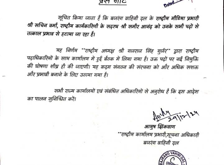 बजरंग वाहिनी दल के राष्ट्रीय कार्यालय प्रभारी एवं सूचना अधिकारी आयुष झींकवान ने प्रेस को जारी विज्ञप्ति...