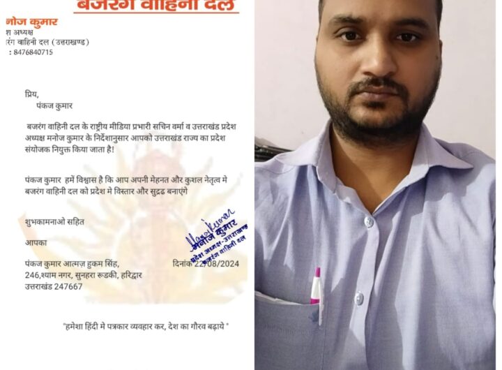 बजरंग वाहिनी दल पंकज कुमार को उत्तराखंड राज्य का प्रदेश संयोजक नियुक्त किया है रुड़की बजरंग...