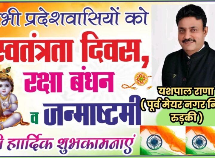 स्वतंत्रता दिवस रक्षाबंधन एवं जन्माष्टमी पर सभी देश प्रदेश वासियों को शुभकामनाएं दी प्रथम मेयर रुड़की यशपाल...