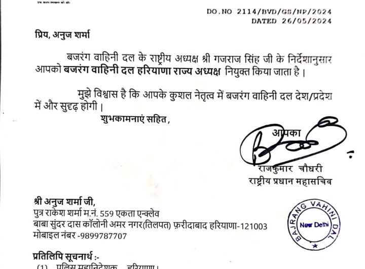 बजरंग वाहिनी दल के राष्ट्रीय अध्यक्ष श्री गजराज सिंह के निर्देशानुसार अनुज शर्मा को बजरंग वाहिनी दल...